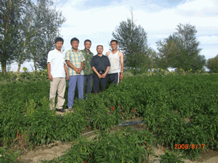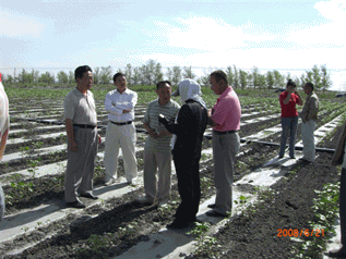 圖1:農(nóng)六師農(nóng)技推廣站領(lǐng)導(dǎo)親自到試驗(yàn)地里考察 圖2:公司技術(shù)員與農(nóng)六師共青團(tuán)負(fù)責(zé)人在試驗(yàn)地里交流