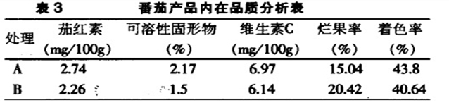 番茄品質(zhì)試驗(yàn)數(shù)據(jù)表明,茄紅素含量對照比處理要低0.48mg/l00g,可溶性固形物低0.67%,維生素C含量低0.83mg/100g,爛果率高5.38%。著色率低3.16%。