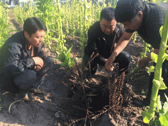 成都華宏總經(jīng)理李智強在鎮(zhèn)賚縣煙草種植大戶試驗田防治列當成功,煙農(nóng)稱今年煙葉是最好的、畝產(chǎn)可達400斤