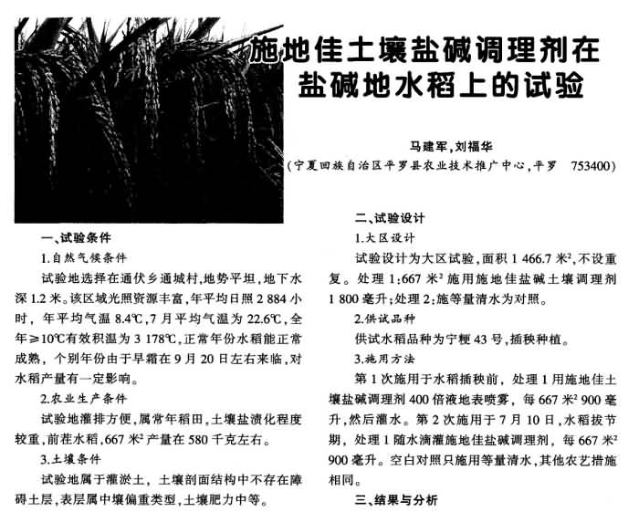 《農(nóng)村科技》2013年第4期 “施地佳”土壤鹽堿調(diào)理劑在鹽堿地水稻上的試驗